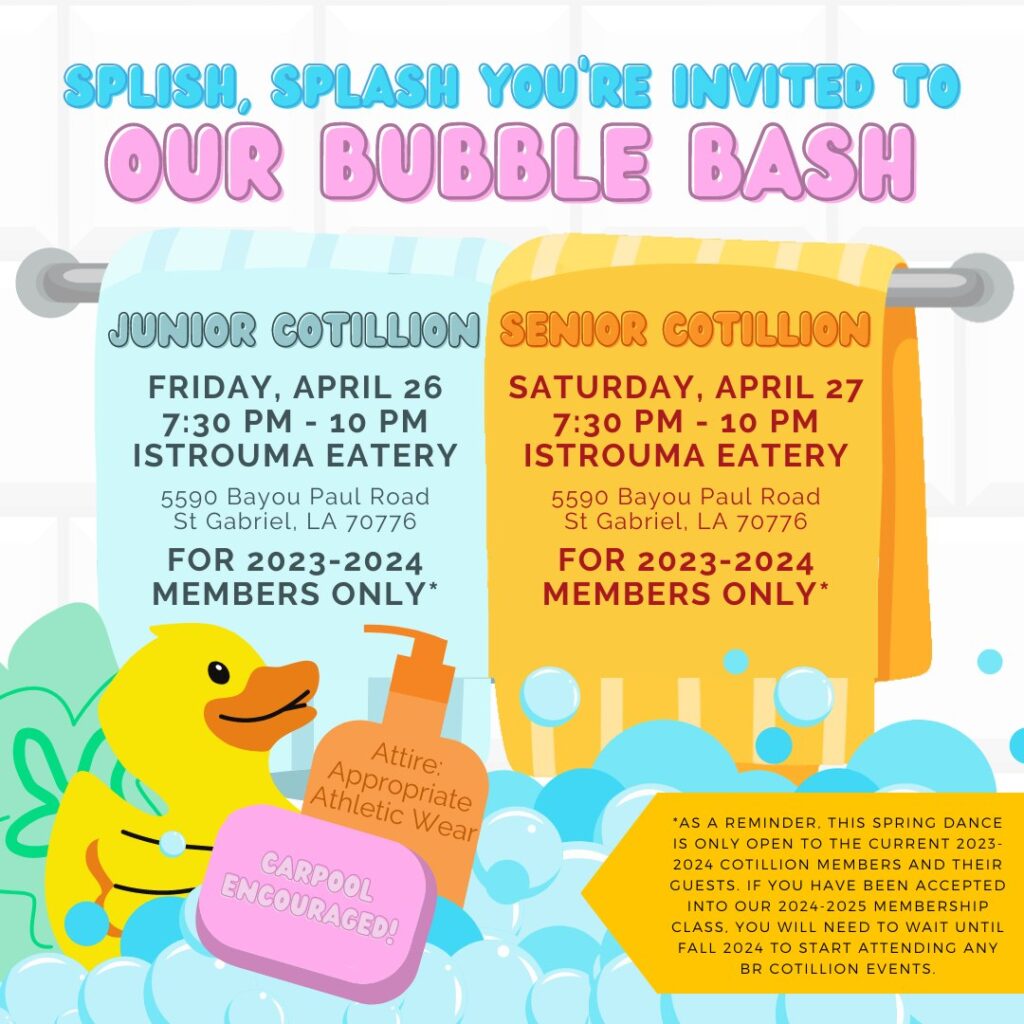 As a reminder, this spring dance is only open to the current 2023-2024 Cotillion Members and their guests. If you have been accepted into our 2024-2025 membership class, you will need to wait until Fall 2024 to start attending any BR Cotillion events.